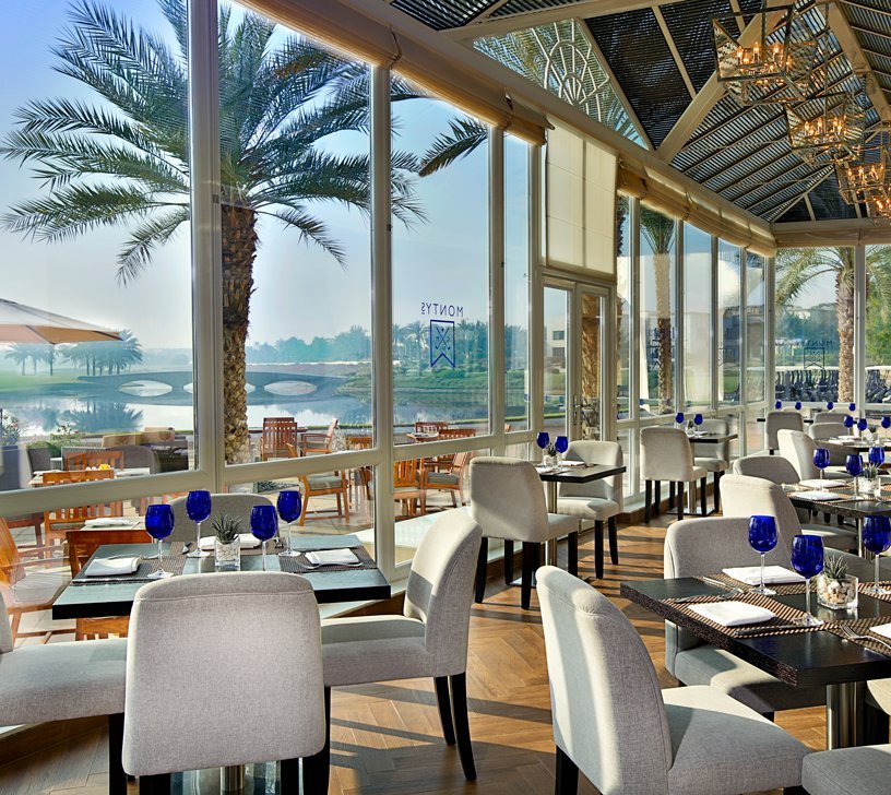 Colin Montgomerie designed this one. a links-parkland blend carved through Emirates Hills, with the Dubai skyline providing the backdrop and an Address Hotel on property complete with pool, spa, and Monty’s restaurant.